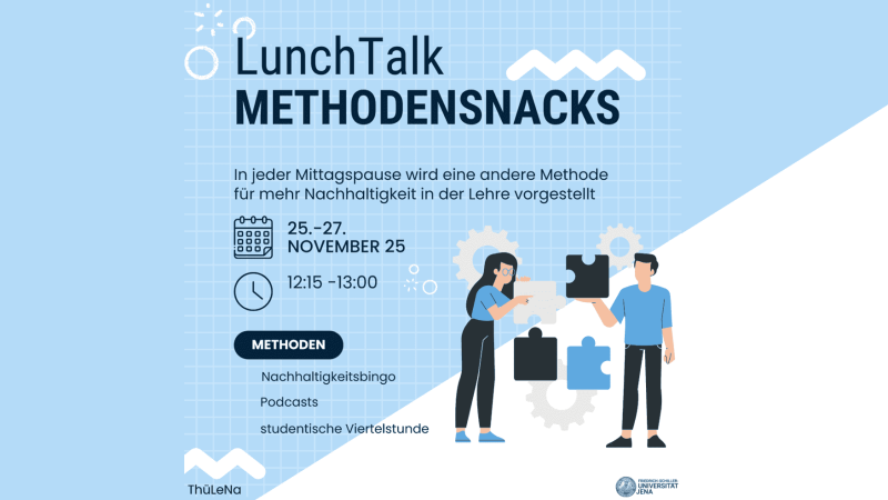 Dann lade ich Sie herzlich ein zur digitalen LunchTalk-Reihe „Methoden-Snacks für nachhaltige Lehre“. In nur 45 Minuten wird Ihnen jeweils eine aktivierende Lehrmethode vorgestellt, die Sie direkt in Ihrer eigenen Lehre nutzen können – ideal für alle, die in ingenieurwissenschaftlichen oder interdisziplinären Kontexten unterwegs sind. Bei Bedarf lenken wir gern auch den Blick auf die direkte Einbindung der Methoden in online Selbstlernkurse.