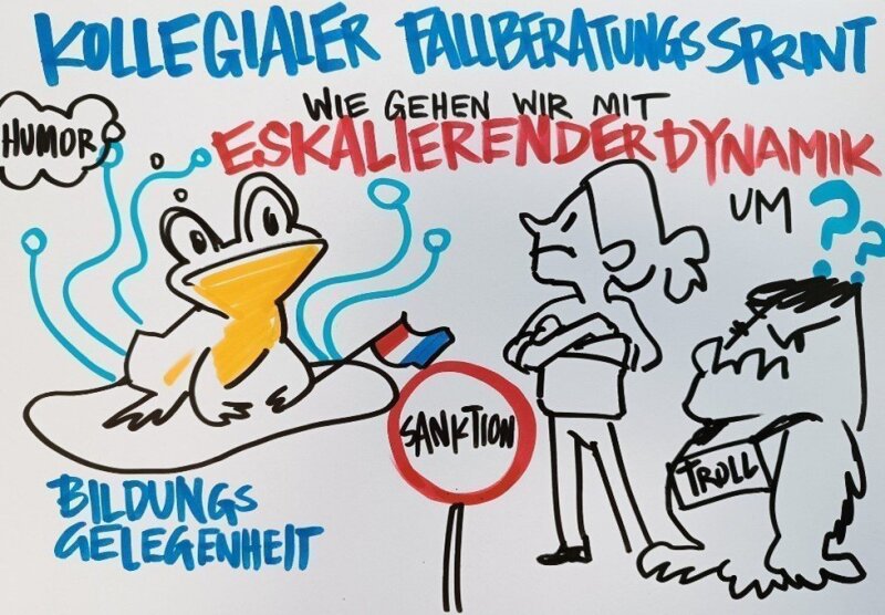 In der darauffolgenden Woche lud das Netzwerk Medienbildung Thüringen schulische Akteure der Medienlandschaft zum „Forum Digital“ an die Universität ein, um sich über die Herausforderungen und die Vielfalt digitaler Angebote an Thüringer Schulen auszutauschen. Auch hier konnte DieP-SV in zwei Sessions die stetig wachsende Fallsammlung einsetzen: In einem kollegialen Fallberatungssprint wurden zunächst in 45 Minuten bereitgestellte Fälle gruppenweise diskutiert und verschiedene Handlungsstrategien ausgetauscht, bevor in einer zweiten Veranstaltung eigene Fälle zur Beratung gestellt wurden.