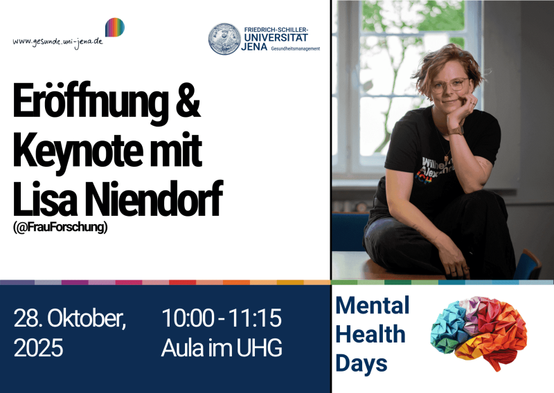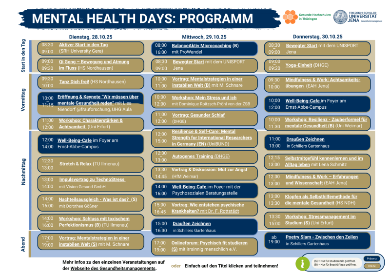 Das Gesundheitsmanagements der Uni Jena veranstalten in Zusammenarbeit mit den anderen Thüringer HochschulenExterner Link hybride Aktionstage zum Thema Mentale Gesundheit vom 28. bis 30. Oktober 2025 anlässlich des internationalen Mental Health Days am 10. Oktober. Es erwarten Sie Vorträge, Workshops, Mikro-Coachings, Cafés und Austausche, ein Poetry Slam, Bewegungsangebote und viele weitere spannende Aktionen. Das Programm finden Sie hier im Überblick und mit mehr Informationen und in den jeweligen Veranstaltungstagen.