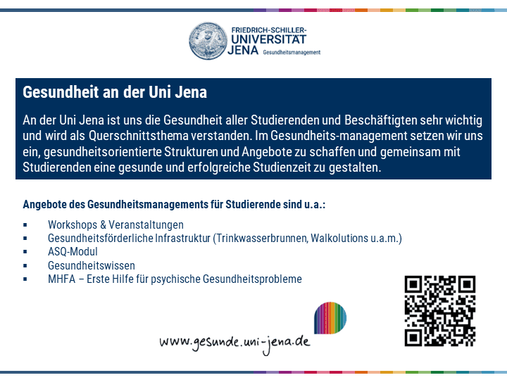 Gesunde Lehre lebt von Abwechslung und aktiven Pausen. Schon kurze Bewegungseinheiten fördern Konzentration und Leistungsfähigkeit – ob im Hörsaal, Seminar oder Home Office. Auf dieser Seite finden Sie Anleitungen und Videoclips für bewegte Pausen, Präsentationsfolien für Mini-Übungen sowie Infos zu unseren Lehrangeboten im Bereich Gesundheitskompetenz. Außerdem zeigen wir, wie Studierende in Projekten und Kooperationen selbst zur Gestaltung einer Gesunden Uni Jena beitragen.