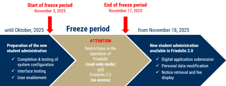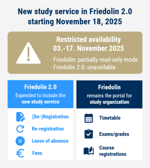 The freeze period will affect the exam registration period in the winter semester of 2025/2026 (via Friedolin) as well as application for certain degree programmes (via Friedolin 2.0).