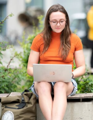 A young woman is doing research on a laptop. She is sitting on a park bench.