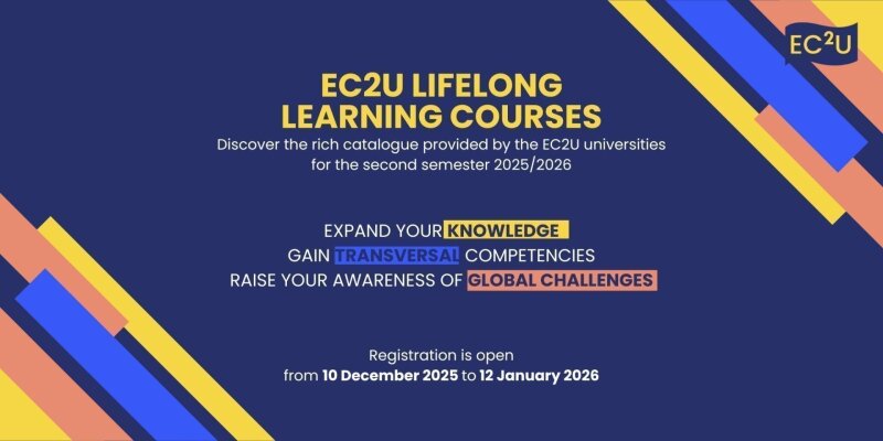 From 10 December 2025 to 12 January 2026, you can enrol in the EC2U Lifelong Learning courses for the second semester of the current academic year. These courses are offered by the Universities of the EC2U Alliance (European Campus of City-Universities)External link, selected by the EC2U Lifelong Learning WP8 subgroup and made available to students.