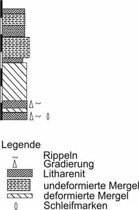Die grauen Litharenite sind gradiert und haben variable Mächtigkeiten bis zu 20 cm (Abb. 2.1.1.) Mächtige Bänke sind intern meist massiv und weisen an ihrer Basis Schleifmarken, "Ball-and-Pillow“ Strukturen und Rippel auf (Abb. 2.1.2., 2.1.3.). Geringmächtige, feinkörnige, schwach verfestigte Sandsteinbänke sind laminiert, dünnen seitlich aus oder werden erodiert. Sie sind von zahlreichen Störungen geringen Versatzes unterbrochen. Schleifmarken weisen auf eine Haupttransportrichtung nach Nord-Nord-West (320°) hin. Hangende Mergel (Mudstones) mit einer Mächtigkeit von < 2 m sind ebenfalls durch zahlreiche kleinere Störungen engständig zerschert. Eine dünngebankte Sand-Mergel-Wechsellagerung am Top des Prallhangs scheint dagegen nicht deformiert. Zwischengelagerte graue Mudstones scheinen massiv, bestehen aber (nur stellenweise zu erkennen) wesentlich aus halbverfestigten Intraklasten von Schlammgeröllen und –fetzen in einer Matrix von nahezu identischer Zusammensetzung, sind also Intraklast-Konglomerate.