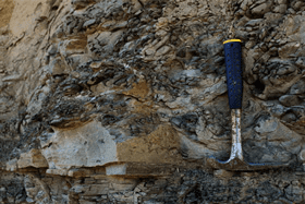 Image: C. HeubeckDer Aufschluss zeigt eine Vielzahl von Tiefwasser-Sedimentationsprozessen: Die sedimentären Strukturen der liegenden, prominenten, gut verfestigten Sandsteinbänke (Tabc) weisen auf einen episodischen, moderat erosiven turbitidischen Sedimenteintrag ohne Modifikation durch kontinuierliche Strömung oder Wellenschlag hin. Die laminierten und dünngebankten deformierten Mergel (Mudstones) scheinen dagegen eher Ergebnis einer distalen Prodeltasedimentation, durch welche Suspensionsfracht kontinuierlich an einem Hang bis zur Überschreitung des kritischen Winkels (angle of repose) abgelagert wurde. Die Intraklast-konglomerate lassen sich aus verdünnten debris flows an submarinen Hängen, eventuell in einem Prodelta-Bereich, ableiten.