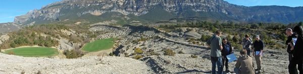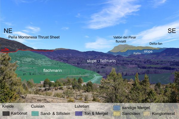 Südlich des Ortes Rañin erstreckt sich der Vallòn del Pinar. Der Top der Bergkette am östlichen Horizont besteht hauptsächlich aus Konglomeraten und Sandsteinen von ca. 800 m Mächtigkeit. Diese sind Teil eines fluviatilen und alluvialen Systems des mittleren Eozän (Lutetian) mit Fließrichtung WNW. In dieser Bergkette gehen die Konglomerate (Abb. 2.4.1, links im Bild) in deltaische, dünn- bis dickbankige Sandsteine (Mitte) und weiter WNW in hangbezogene, feingeschichtete tiefmarine Mergel und Tone (Abb. 2.4.1, rechts) über. Letztere wurden von WSW nach NE als Turbiditströme in das Ainsa-Basin transportiert. Gleichzeitig wurde durch die Auffaltung und Heraushebung der Mediano-Antiklinale im Norden eine topografische Erhöhung geschaffen, welches im frühen Eozän (Cuisian) eine flachmarine, schelfnahe und dünn- bis dickbankige siltig-sandige-Wechselfolge nördlich von Charo verursachte und die Schüttung der Turbidite nach Nordwesten abdrängte.