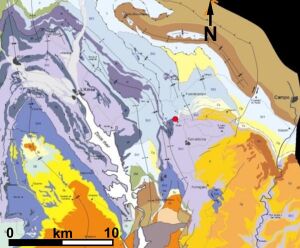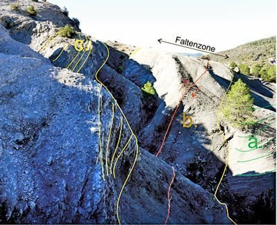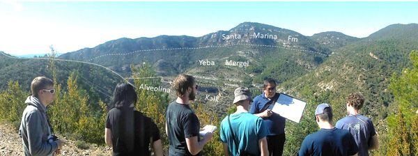 Picture: Google MapsDie ost-vergente Mediano-Antiklinale misst etwa 20 x 9 km und besteht im wesentlichen aus drei Schichteinheiten (Abb. 2.5.2.): Der Kern der Antiklinale besteht aus triassischen Rotsedimenten mit Evaporiten, überlagert durch den Alveolina-Kalk des Ilerdium, benannt nach den in ihm auftretenden Großforaminiferen. Darüber folgen mächtige Mergel der Yeba-Formation, überlagert durch Kalke der Santa Marina-Formation. Diese Schichtabfolgen repräsentieren unterschiedliche Meeresspiegelstände: Die Santa-Marina Formation sowie der Alveolina-Kalkstein sind flachmarine, regressive Bildungen; die Yeba-Formation ist transgressiv.