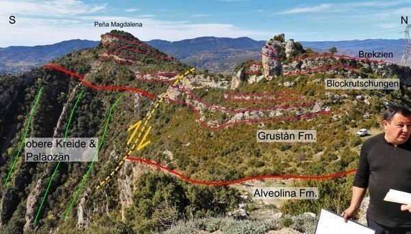 Image: C. HeubeckDie Geologie der Gipfelregion zeigt einen Teil des synsedimentären Wachstums der Mediano-Antiklinale (Abb. 3.1.3). Schwach (~10°) geneigte flachmarine Plattformkarbonate des mittleren Eozäns (Lutetian, Grustàn Fm.) liegen dort winkeldiskordant über steilgestellten (49°-62°) Karbonate und Mergel der Oberkreide, des Paläozäns und des unteres Eozän (Ypresian, Alveolina Fm.).Namensgebend für die dünn- bis dickbankigen Karbonate der Alveolina Fm. sind benthische Foraminiferen (Alveolina), die neben Nummuliten in den Kalkbänken z.T. gesteinsbildend auftreten. Die dickbankigen-massigen Plattformkarbonate der hangenden Grustàn Fm. sind reicher an Siliziklastica und enthalten neben benthischen Foraminiferen auch Mollusken und Fragmente von Echinodermen. Diese flachmarinen Plattformsedimente gehen nach Norden und Westen in karbonatische Hangbrekzien mit Klastengrößen bis in den m-Bereich, Kalkareniten und schließlich in die offen-marinen Mergel und Mudstones der Yeba Fm. über.