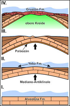 Image: C. HeubeckAbb. 3.1.4: Vereinfachte Darstellung zur Entwicklung der Mediano-Antiklinale und synsedimentärer Formationen.