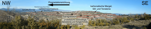 Etwa 11 km sw Ainsa liegt auf einer Anhöhe das Dorf Castellazo, welches über eine geteerte, wenn auch enge Landstraße erreichbar ist. Vom nördlichen Dorfausgang bietet sich dem Betrachter ein Panoramablick nach Osten über die Barranco de Castellazo auf den nicht ganz 2 km entfernten gegenüberliegenden Berghang, in welchem über mehrere km Streichlänge die Progradation des Sobrarbe-Delta-Komplexes, den wir im vorherigen Stop im Straßenprofil durchlaufen hatten, aufgezeichnet ist (Abb. 3.4.1).