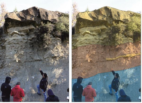 Der letzte Exkursionsstopp des Tages führte uns auf der A-138 etwa 5 km nördlich von Ainsa zum Parkplatz des Hotels Peña Montañesa, östlich der A-138 gelegen. Wir überquerten die Straße (Vorsicht !) Richtung Westen und folgten einer ungeteerten Landstraße (die entlang des Tälchens des Rio Forcaz zu einem ausgeschilderten Steinbruch führt) für wenige hundert m zu Aufschlüssen auf beiden Talseiten. Hier sind Tiefwasser-Tonsteine und Mergel zwischen den Ainsa-Komplexen I und II aufgeschlossen. Unser Hauptaugenmerk lag auf den Sedimentgesteinen, die die beiden Rinnenkomplexe voneinander trennen, und ihren Deformationsstrukturen (Abb. 4.4.1, 4.4.2).