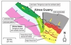 Der aufgelassene "Ainsa Quarry" (Abb 4.2.1) ca. 1,5 km südlich von Ainsa ist von großer Bedeutung für Exkursionen der Kohlenwasserstoffunternehmen, da er exemplarisch zahlreiche Reservoireigenschaften und die Geometrien mehrerer Tiefwasser-lithofazies auf seismischem Maßstab zeigt und dennoch fast überall zur geologischen Inspektion zugänglich ist. Der Aufschluss erschließt eine eozäne Sandstein-Mergel-Wechselfolge, dessen Sande in drei Rinnenkomplexe (channel complexes Ainsa 1 bis 3) gegliedert werden. Der Aufschluss ist ca. 42 m hoch und ca. 750 m lang (Arbues et al., 2007). Jede Rinnenfüllung wird im Hangenden von Tonsteinen begrenzt. Die im Hauptsteinbruch erschlossene Rinnenfüllung Ainsa 1 zeigt fünf einzelne Lithofazies, die in Detail bis in den cm-Maßstab hinein beschrieben werden können (Arbues et al., 2007).
