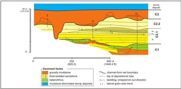 Image: C. HeubeckAbb. 4.3.2: Schematischer interner Aufbau eines slope channel complex am Beispiel von Ainsa-2