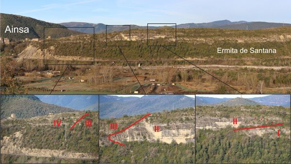 Von einer Talschulter nördlich von Ainsa, östlich des Rio Cinca, hat man (vor allem bei Sonne im Osten !) einen ausgezeichneten Blick westwärts über das Tal des Rio Cinco hinweg auf die steile Talflanke der Ermita de Sant'ana. Auf der südlichen Verlängerung dieses Hügelzugs, welches den Rinnenkomplex Ainsa-2 aufschließt, steht die mittelalterliche Altstadt Ainsas mit ihrer Burganlage.