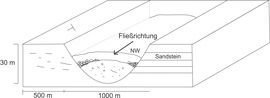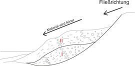 Picture: Andreas JakobiNach dem Rinnenfüllung I abgelagert wurde, tiefte sich in ihn Rinne II ein, die dann verfüllt wurde. Dabei erodierte Komplex II die unterliegende Ablagerung, so dass sich erosive, schaufelartige Strukturen und sich zurückziehende ("back-stepping") Geometrien bildeten. Mit zunehmender Transportweite nahm die Korngröße des Materials hangabwärts ab.