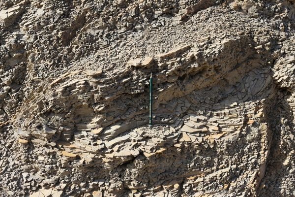 Picture: Foto: C. Wagner, Bearbeitung L. GanderMächtige graue bis beige Tonsteine trennen die Rinnenfüllungen des Ainsa-I-Komplexes. Sie weisen teilweise eine ausgeprägte, offene bis isoklinale Biege- oder Knickfalten in cm- bis m-Maßstab auf (Abb. 4.4.2). Die Falten sind nicht systematisch angeordnet, sondern durch Fließstrukturen voneinander getrennt. "Floating hinges" (isolierte Scharniere) sind häufig. Diese "schwimmen" in einer tonig-silit-sandigen Grundmasse mit Schlieren, die auf eine viskos-plastische Deformation des noch unverfestigten Sediments hinweisen, in welches gerutschte und verfaltete, kompetentere Sedimente inkorporiert wurden.