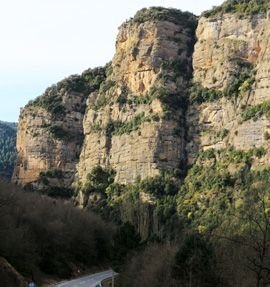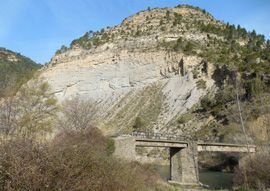 Südlich des Dorfes Morillo del Liena durchquert die A-139 entlang einer tief eingeschnittenen Schlucht über ca. 10 km Länge mächtige Konglomerate und dickbankige Sandsteine des Tremp-Graus Beckens, die im folgenden Stopp näher beschrieben werden. Die Basis dieser Einheiten ist gut von der Brücke des Dorfes Santa Liestra zu sehen (Rafting-Anlegestelle), wo graue, feinkörnige Turbidite von Sandsteinen in Prodelta- und Deltafazies überlagert werden (Abb. 5.3.1). Diese sind die distalen Äquivalente der wenig weiter nördlich anstehenden alluvialen Konglomerate.
