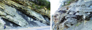 Abb. 5.5: Links: Upward-coarsening, upward-thickening Sandschüttungen zwischen grauen Ton- und Siltsteinen eines (oberen) Prodeltas, überlagert von gelben kreuzgeschichteten Sandsteinen der deltaischen Mündungsbarre und der unteren fluviatilen Überflutungsebene. Rechts: Große ball-und-pillow-Deformationsstrukturen einer Sandsteinbank des oberen Prodeltas.