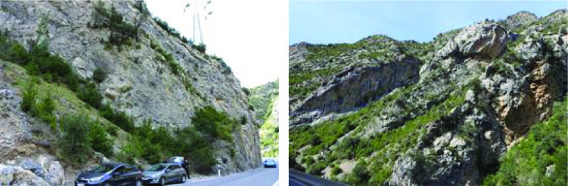 Abb. 5.6.1a, b: Die Campo-Brekzie entlang der N-260 in der Ésera-Schlucht, nördlich vom Campo.