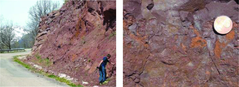 Abb. 5.7.1: Triasssische Rotsedimente entlang der Straße Castejon - Liri. Links Straßenaufschluss. Die auf den ersten Blick homogenen, glimmerführenden und schwach metamorph überprägten Tons- und Siltsteine zeigen bei Nahbetrachtung eine erhebliche texturelle Vielfalt. Rechts: Nahaufnahme der Schichtfläche eines Tonklastenkonglomerats mit Bioturbationsspuren.