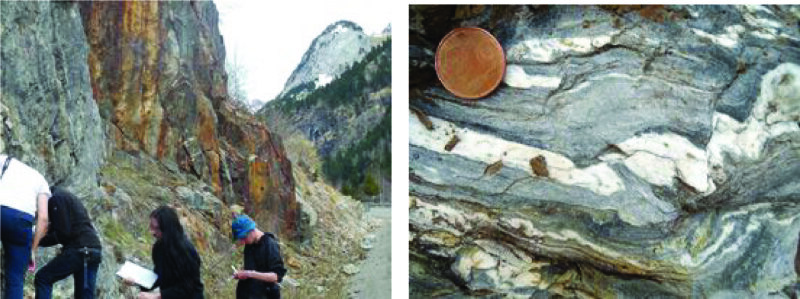 Abb. 5.9: In der Zentralzone der Pyrenäen. Links: Deformierte Leukosome in einem Kalksilikatschiefer im Valle de Benasque. Rechts: Kontaktmetamorphe Aureole eines dioritischen Intrusivköpers in mergelige paläozoische Metasedimente. Die resultierenden Hornfelse, Kalksilikatschiefer und Greise führen Granat und Pyrit; letzterer verwittert im Aufschluss zu braunrotem Goethit und Limonit.