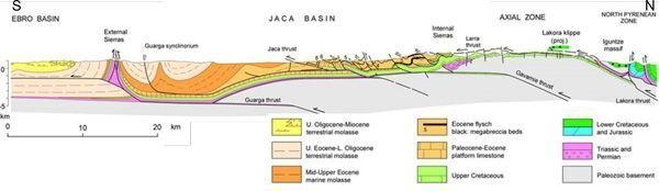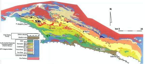 Interessant sind die neun "Megaturbidite" (ein Misnomer; es sind Megabrekzien und debris flows) der früh- bis mitteleozänen Hecho Formation, die als Olisthostrome in die schmale, tiefe Rinne des Jacabeckens glitten. Sie enthalten bis zu hausgroße Blöcke der südlich angrenzenden Plattformkarbonate (Hogan and Burbank, 1996; Larrasoaña et al., 1997; Payros et al., 1999; Teixell, 1996; Moss, 2005; Teletzke, 2012).