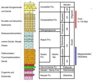 Image: Teixell, 1996Die hohe Sedimentationsrate des Jaca-Beckens wird mit der Hauptphase der tektonischen Hebung der Pyrenäen, der hohen Verkürzungsrate (geschätzte 4,5 mm/Ma) und einer hohen Subsidenz (ca. 33 m/Ma) in Verbindung gebracht.