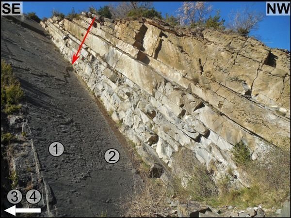 Picture: Payros et al., 1999Die anstehenden Gesteine sind Teil der MT-4 ("4. Megaturbidit")-Sequenz der tiefmarinen Hecho Fm. Die diskordant aufliegenden, sandigen Karbonate glitten von den südlichen, flachmarinen Plattformkarbonaten in Form von großen Olisthostromen ab. Insgesamt sind bisher neun dieser Sequenzen im Jaca-Becken bekannt.