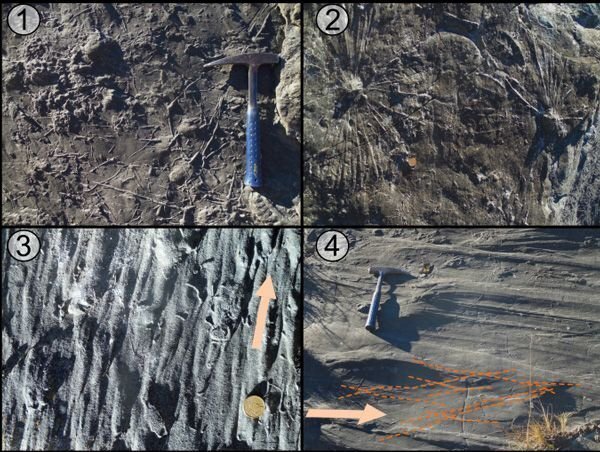 Abb. 6.1.3: Sedimentäre Strukturen an der Basis von Sandsteinbänken (die Wurm-Perspektive; "worm's-eye view"). 1: Grabgänge von Planolites und Thalassinoides; 2: Radialstrahlige Grabgänge von Phoebichnus. 3: Sandverfüllte Kolkmarken, d.h. durch turbulente Wirbel gebildete erosive Vertiefungen ("flute casts"). 4: Wenig erosive Riefen ("tool marks").