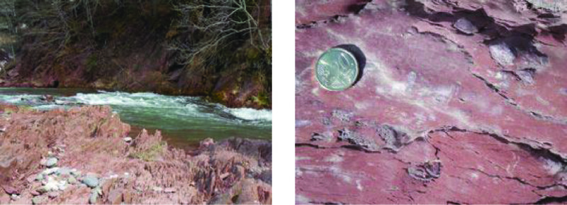 Abb. 6.3.2: Aufschluss am Campingplatz Selva de Oza, wenige m stromabwärts der Brücke über den Gebirgsbach. Steilstehende, mäßig geschieferte rote Ton- und Siltsteine triassischen Alters (links) bestehen aus Tonklastkonglomeraten, zeigen Grabspuren (rechts) und möglicherweise Entwässerungsstrukturen, alles Hinweise auf terrestrische und (semi-)aride Sedimentation, wie sie zu dieser Zeit auch im Germanischen Becken, einem anderen Teilbereich Pangäas, verbreitet war.