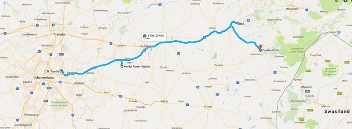 Abb. 2.2.1: Route des ersten Tages (Google Maps) mit Stopps am Kohlekraftwerk Kendal, einem Aufschluss im Witbank-Kohlefeld sowie am Wasserfall des Eland Rivers bei Waterfall Boven.