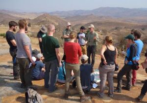 Abb. 3.1.1: Prof. Heubeck gibt den Exkursionsteilnehmern ihre erste Vor-Ort-Einführung der regionalen Geologie, hier auf demTonalit des Stolzburg Plutons (~3440 Ma).