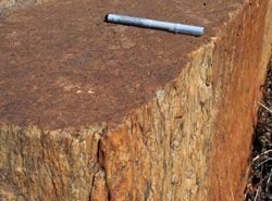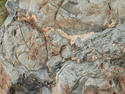Abb. 3.1.2: Aufschlussdetail in einem Septum zwischen dem Stolzburg und dem Theespruit Pluton nahe Tjakastad. Vertikal gestrecktes Konglomerat aus felsischen Metavulkaniten (ca. 3520 Ma Ablagerungsalter), 300 Ma später zu einem S-Tektonit deformiert.