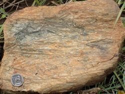 Image: C. HeubeckLäuft man den Straßenaufschluss ab und nähert sich dem Kontakt aus dem Tonalit heraus, fällt die zunehmende gneisartige Foliation durch Einregelung von Hornblende und Feldspatkristallen und abnehmende Kristallgröße in dem orange verwitterenden Gestein auf. (In der Barberton Sandgrube, nur ca. 1.5 km entfernt, war nur eine schwach ausgeprägte magmatische Einregelung festzustellen). Die Foliation ist parallel zum Kontakt und fällt nach Norden.
