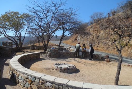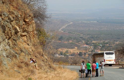 Abb. 3.3.1: Geotrail-Stop an der in die Berge führenden Straße R40 ca. 2 km außerhalb von Barberton. Im Hintergund der Kontakt zwischen BGB (links) und KVT (rechts).
