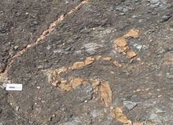 Image: C. HeubeckAbb. 3.3.3: Detailaufnahme von mafischem Schiefer in der Kontaktzone. Dünne pegmatoide Quarz- und Feldpatgänge sind in der Foliation verfaltet.