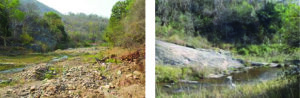 Abb. 3.4.3: Vorher und nacher. Links: Verlassene Gruben im Bachbett des Fig Tree Creek (2016). Rechts: die gleiche Stelle 2014, als Heubeck und Fugmann hier noch Fischottern auf der Suche nach Muscheln begegneten. Die primitiven Methoden zerstören das fluviatile Ökosystem und vernichten die Nutzung des Flußlaufs für langfristigere und allgemeinnützliche Zwecke (Trink- und Waschwasser, Viehtränke). Eine Mobilisierung von Arsen wird vermutet, ist aber nicht nachgewiesen.