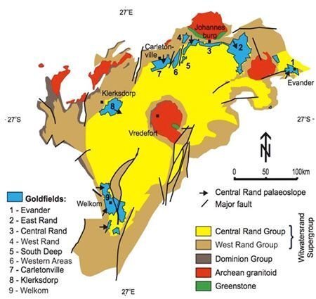 Südafrika besitzt die nach Ressourcen größte Goldlagerstätte der Erde, das spätarchaische Witwatersrandbecken. Gold wird seit 1888 an seinem Nord- und Westrand, einem Gebiet etwa der Fläche Belgiens, in der Umgebung südlich von Johannesburg gefördert. Gold wird in zahlreichen großen Untertageminen gefördert. Die Betriebe der Western Deep Levels Region erreichen bis über 4 km Abbautiefe und sind damit die tiefsten der Welt.