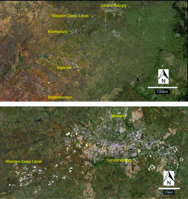 Picture: Frimmel, 2005Abb. 5.1.2: Die großen Goldfelder des Witwatersrandsbecken im Satellitenbild (vgl. Abb. 5.1.1). A) Region südlich Johannesburgs; B) Ausschnitt aus A (Region um Johannesburg). Die hellsten Flecken sind die Oberflächen der Halden aktiver oder stillgelegter Goldminen; siehe dazu auch Abb. 5.3.2.