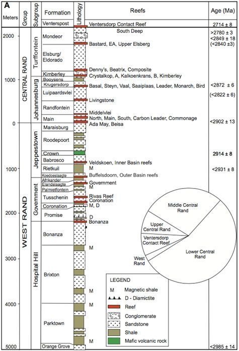 Picture: Google MapsAbb. 5.1.3: Stratigrafie der Witwatersrand-Supergruppe. Goldführende Konglomerate sind rot markiert. Die Beckenfüllung besteht aus einer etwa 7 km mächtigen siliziklastischen Folgevon schwachmetamorphen Tonsteinen, Sandsteinen und Konglomeraten. Gold befindet sich vor allem in der fluvial dominierten Central Rand Gruppe