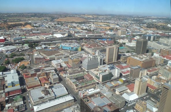 Abb. 5.3.1: Ausblick vom Carlton Center über den Central Business District (CBD) Johannesburgs nach Süden. Auffällig ist das Band der gelben Abraumhalden im Mittelgrund.