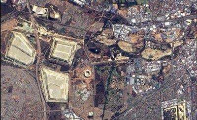 Um uns einen Überblick über Johannesburg zu verschaffen, besuchten wir die Aussichtsplattform im 45. Stock des mit 223 Metern höchsten Gebäudes der Stadt, des Carlton Centers. Wolkenloses Sonntagsmorgenwetter ermöglichte uns einen weiten Blick. Uns fielen besonders die durch den Goldabbau entstandenen Halden (tailings) der Goldminen entlang des Südrands der Innenstadt auf (Abb. 5.3.1). Sowohl die neu angelegten als auch die alten Halden sind auf Satellitenbildern deutlich zu erkennen.