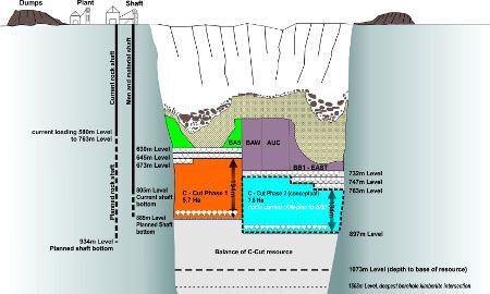 Image: C. HeubeckDer Oberflächenausbiss von 32 Hektar verjüngt sich trichterartig in die Tiefe; der Schlot nimmt an der tiefsten Abbausohle (820 m unter Tage) eine Fläche von 16 Hektar ein. Kimberlite sind brekziöse ultrabasische Gesteine aus dem Erdmantel, welche in senkrechten Schloten Mantelmaterial, darunter auch Diamanten, mit sich reißen. Der Schlot ist von unterschiedlichen Kimberlitvarietäten verfüllt (die vulkanoklastischen "brown" und "grey kimberlite" und die subvulkanische blassdunkle Spätphase), die von späten kohligen Gängen durchschlagen werden.