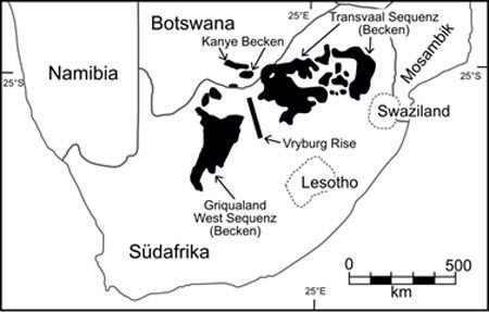 Abb. 6.1.1: Aufschlussgebiete der Transvaal Supergroup. Der Vryburg Rise trennt die Vorkommen in Griqualand West von denen des Transvaal Beckens