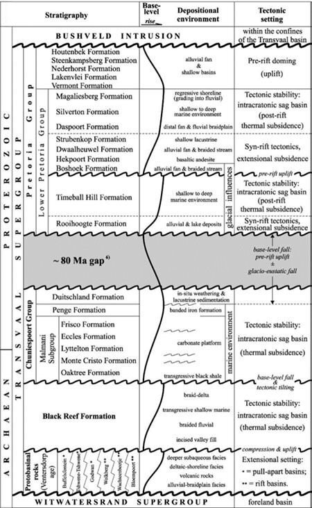 Picture: modifiziert nach Eriksson et al., 2001Die Black Reef Formation besteht zum Großteil aus fluviatilen, deltaischen und flachmarinen Sandsteinen und wurde zu einer Zeit tektonischer Stabilität und Subsidenz abgelagert (Eriksson et al., 2001). Dies hatte einen relativen Meeresspiegelanstieg und so die Bildung mächtiger karbonatischer Plattformen und gebänderter Eisenerze (BIF) der Chuniespoort Gruppe zur Folge. Diese Phase hielt etwa 30 bis 50 Ma an. Im Zuge einer anschließenden erosiven Periode setzte eine extensive chemische Verwitterung und Verkarstung dieser Gesteine ein (Eriksson und Altermann, 1998)