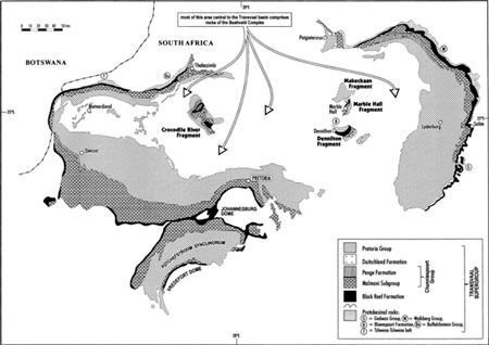 Die Transvaal Supergroup wird stratigraphisch in die basale Black Reef Formation und die überlagernde Chuniespoort und Pretoria Gruppen unterteilt. Die Basis, in der "protobasinale" vulkanosedimentäre Gesteine vorkommen (Abb. 6.1.2), tritt als eigenständige Einheit nur am Rand des Transvaal Beckens auf (Eriksson et al., 2001; Abb. 6.1.3).