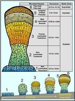 Stromatolithe sind Strukturen, die durch die Stoffwechselaktivität von Mikroorganismen, vor allem Cyanobakterien, gebildet werden. Sie bestehen aus Lagen mikrobieller Matten und ausgefällter Minerale sowie eingefangenen klastischen Sedimenten (NASA Ames Research Center, 2007; Abb. 6.2.1).