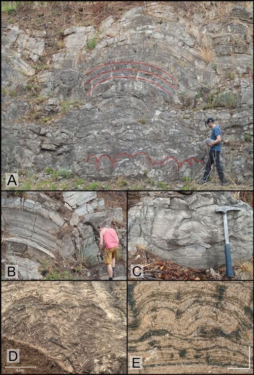 Abb. 6.2.3: Aufschlussphotos der stromatolithischen Dolomite entlang der R539. A und B: Verlinkt-säulige Stromatolithe an der Basis, überlagert von Domen. C - E: Details stromatolithischer Laminae.