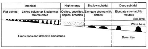 Abb. 6.2.4: Tidal-subtidales Modell der Paläoumgebung der Malmani Stromatolilthe. Formen sind abhängig von Wassertiefe, Strömung und Wellenenergie.