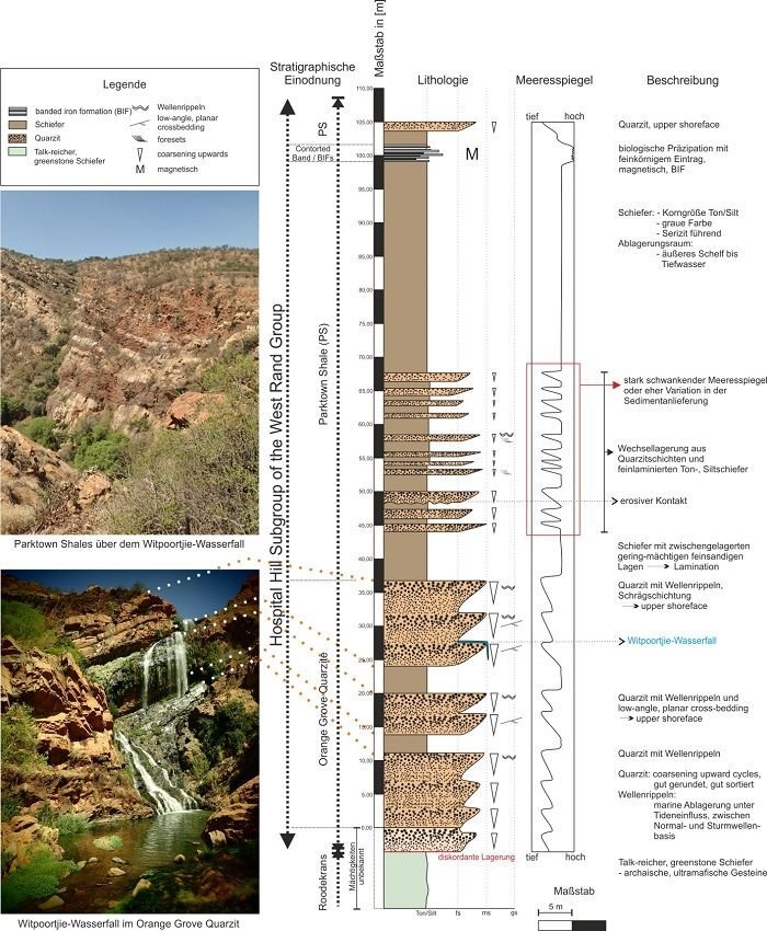 Abb. 6.3.3: Stratigraphisches Profil mit Fotografien des Parktown Shales und Orange Grove Quarzites am Witpoortjie-Wasserfall.